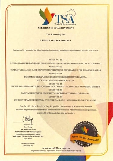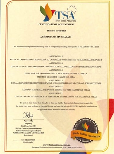 You will undergo the training of latest AS/NZS 60079 with experienced trainers and conduct a site in Malaysia hazardous areas inspection at this 4 day course. The certification will then be issued by TSA (Tech Skill Australia) with RTO 52737.